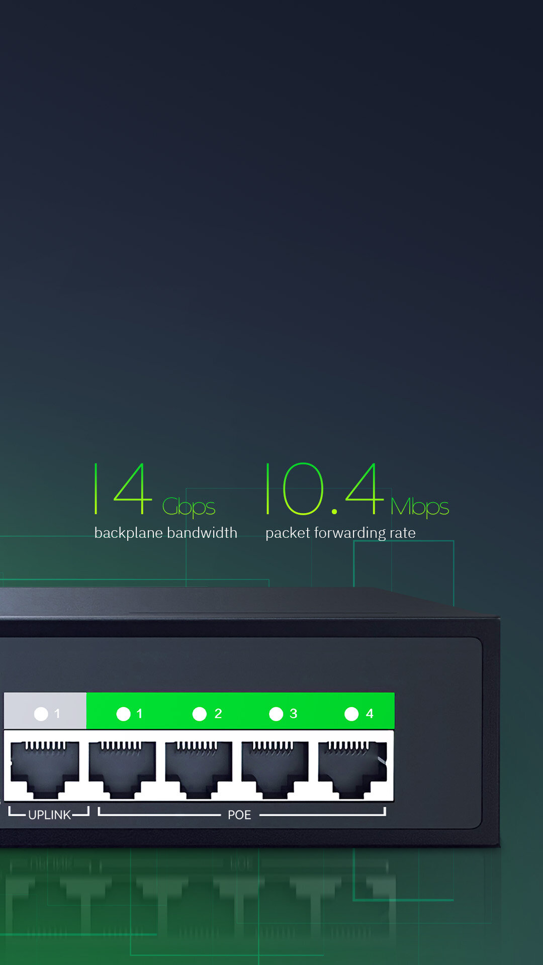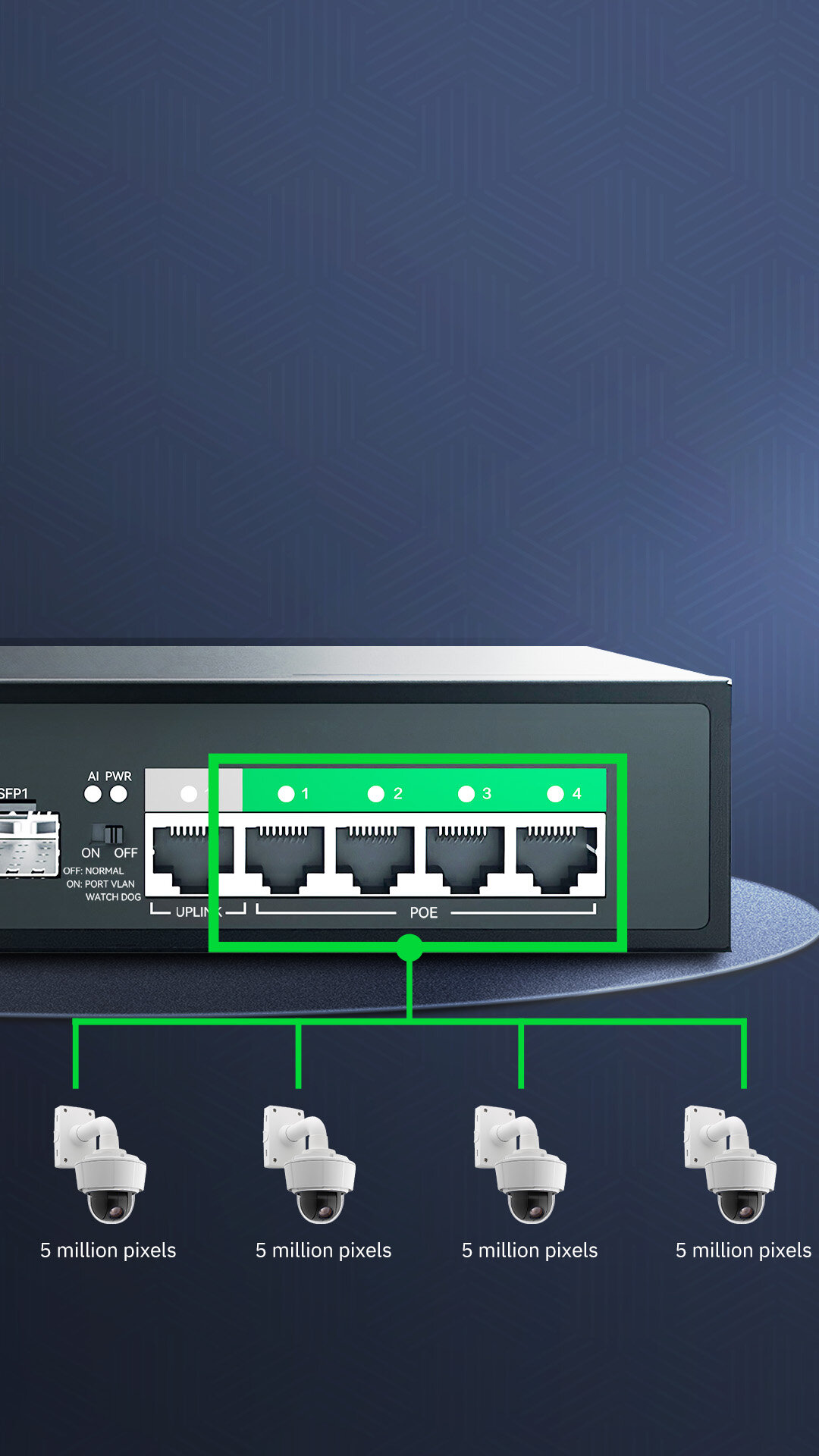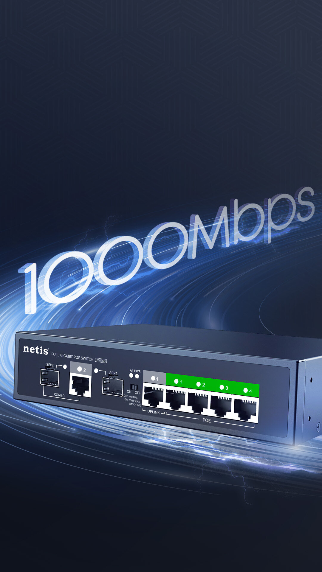 4 10/100/1000Mbps POE RJ45 Ports(Data/Power) 1 10/100/1000Mbps RJ45 Port(Data) 1 Combo 100/1000Mbps SFP Slot(Data) |