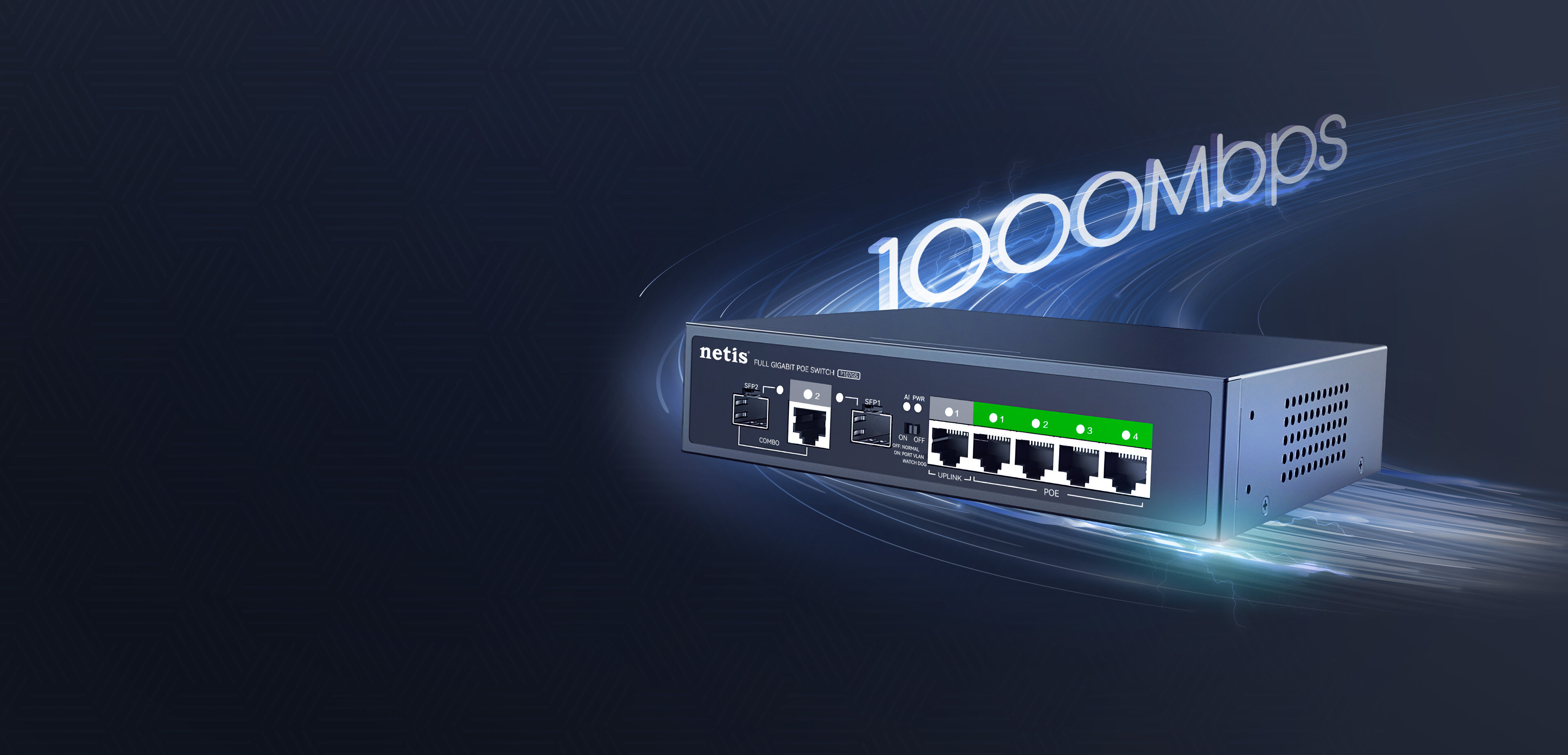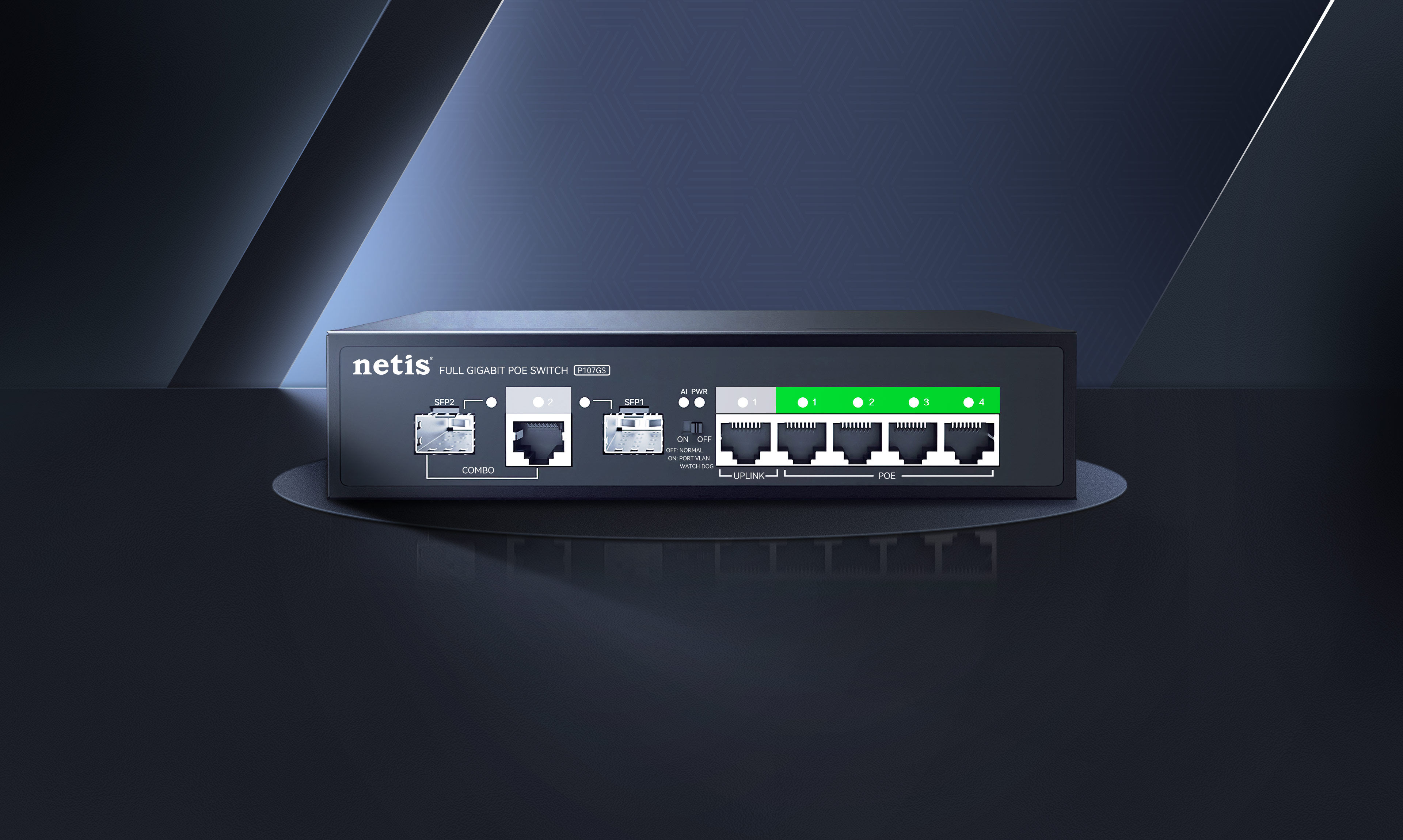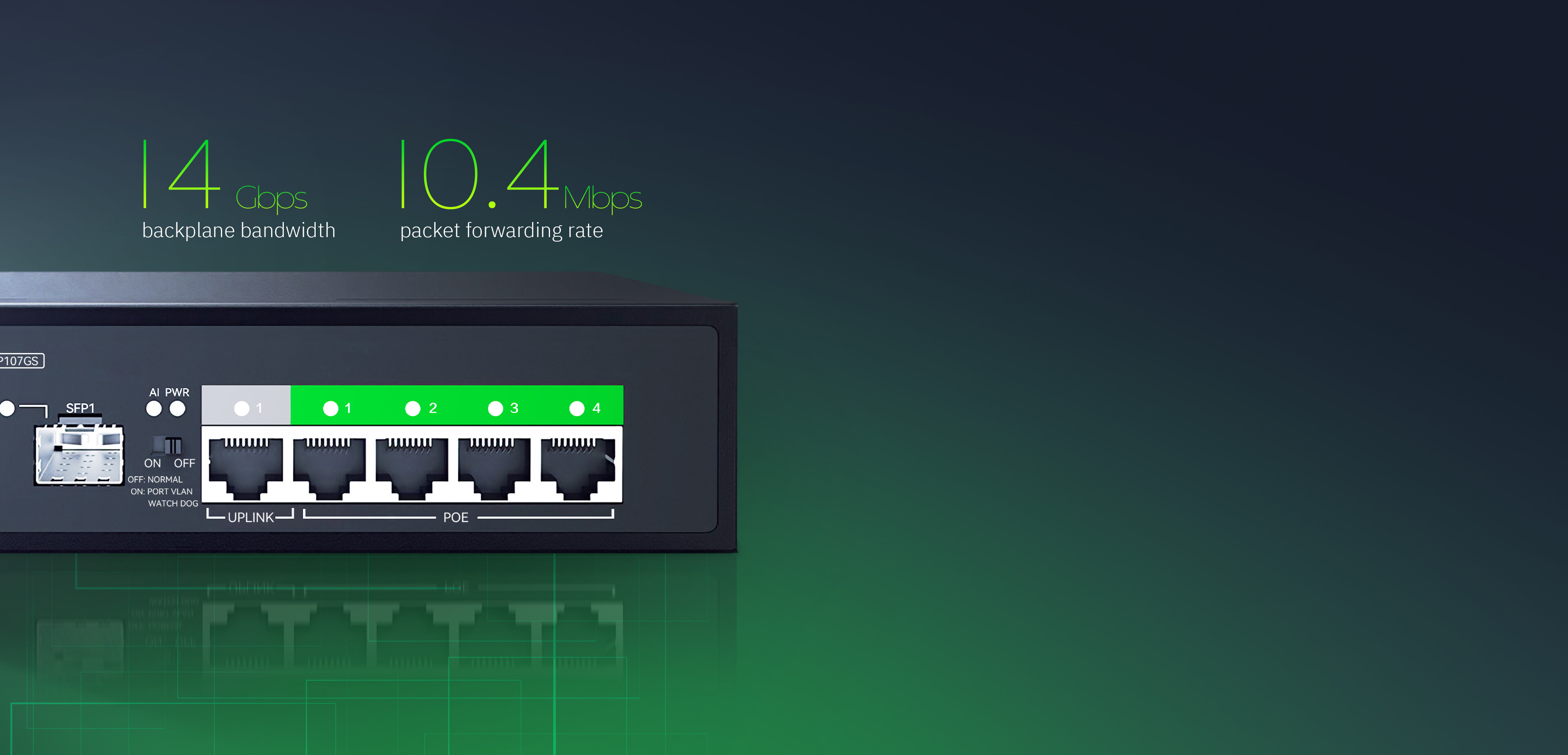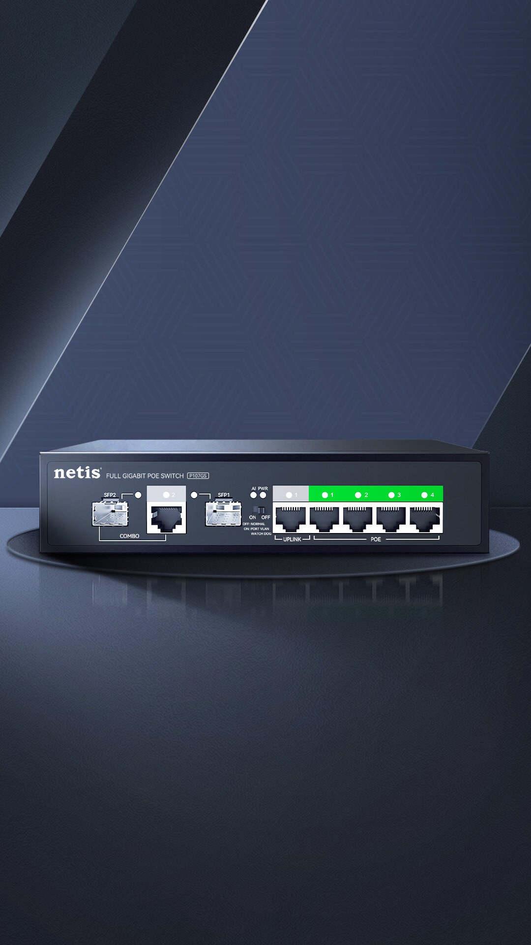 4 10/100/1000Mbps POE RJ45 Ports(Data/Power) 1 10/100/1000Mbps RJ45 Port(Data) 1 Combo 100/1000Mbps SFP Slot(Data) |