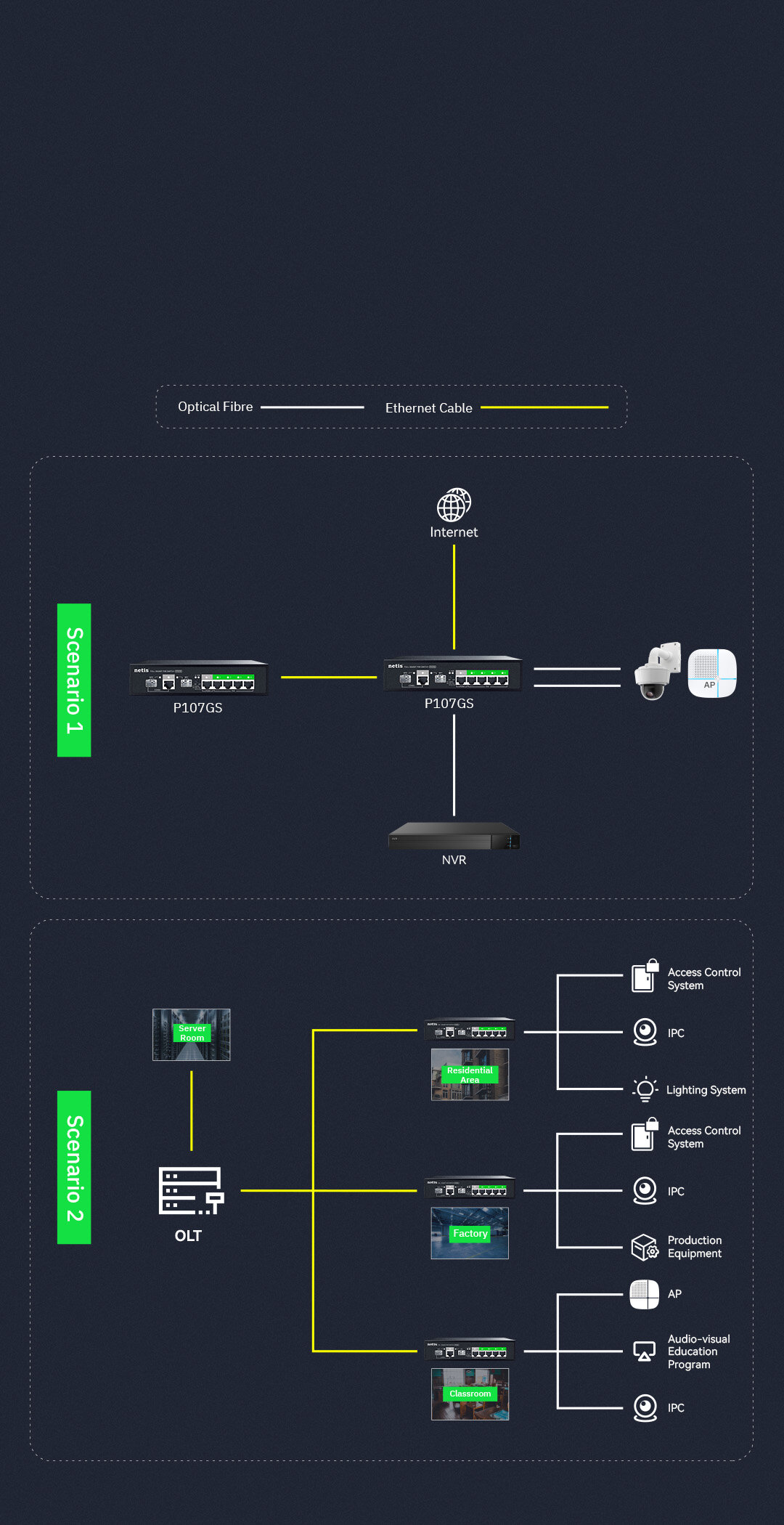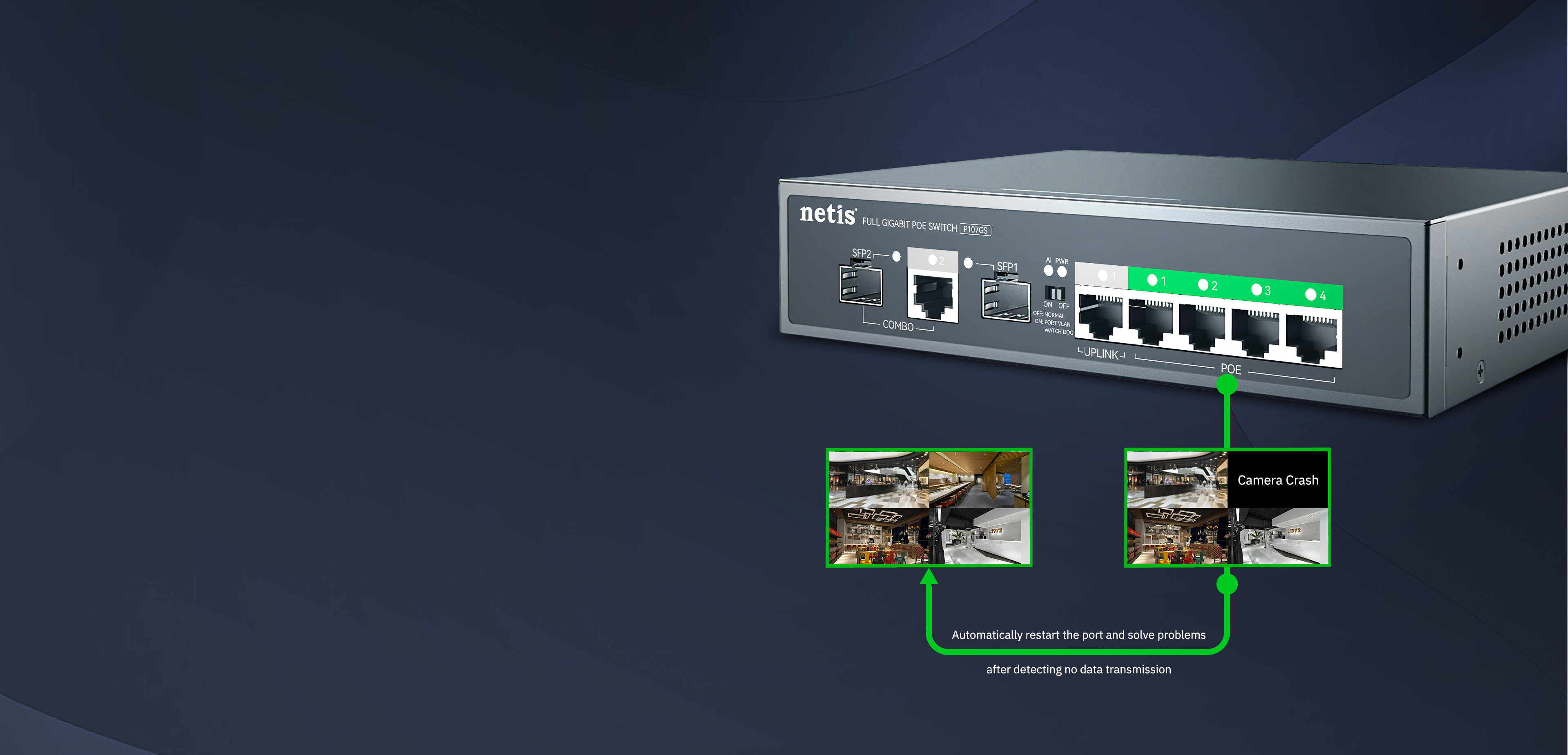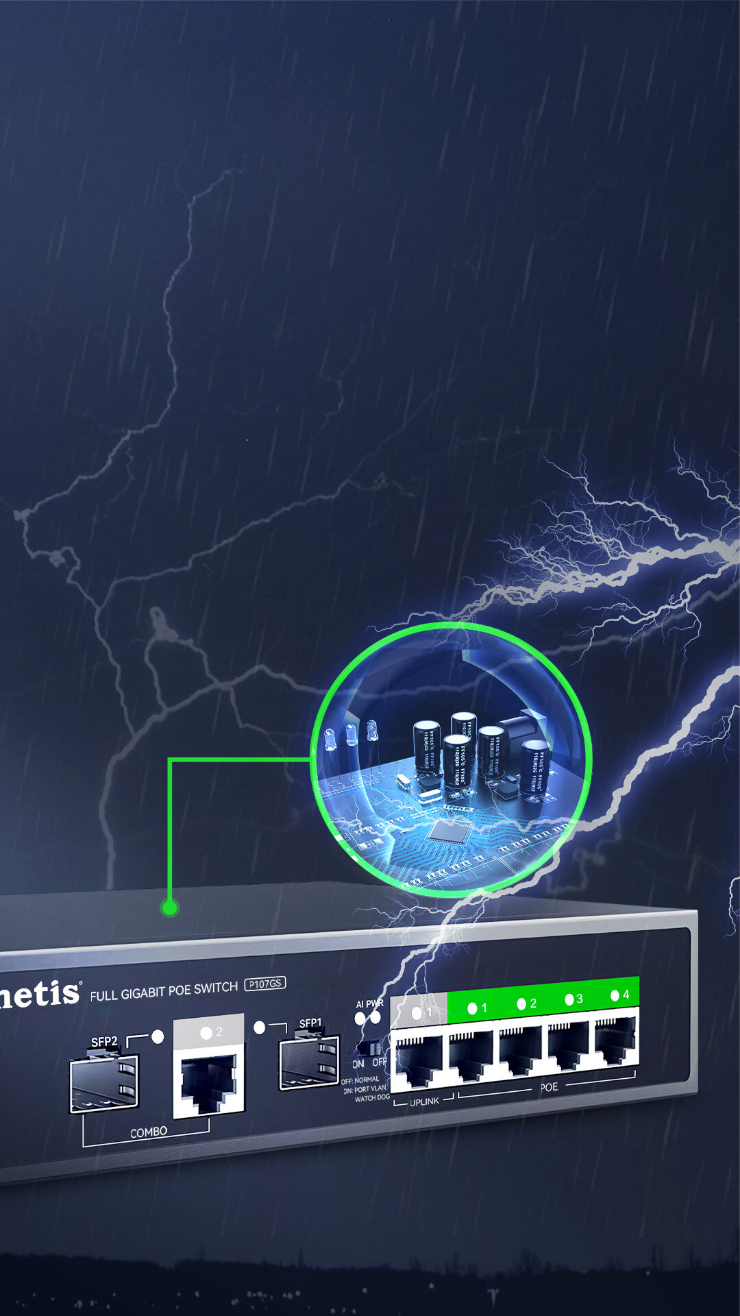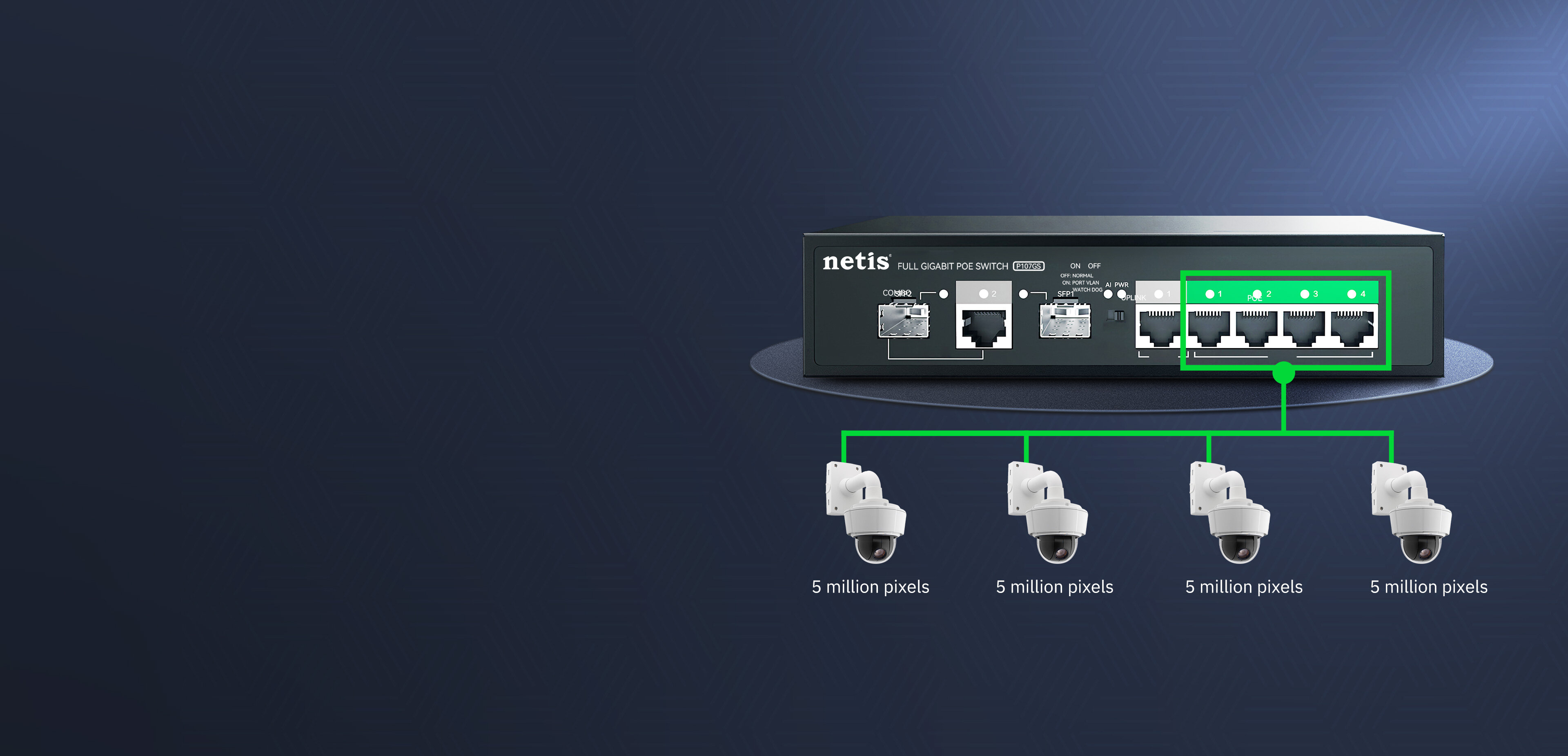 65W budget support IEEE802.3af/at power supply, Up to 30W for each port, stable operation in full load with full gigabit AP & 5MP camera.