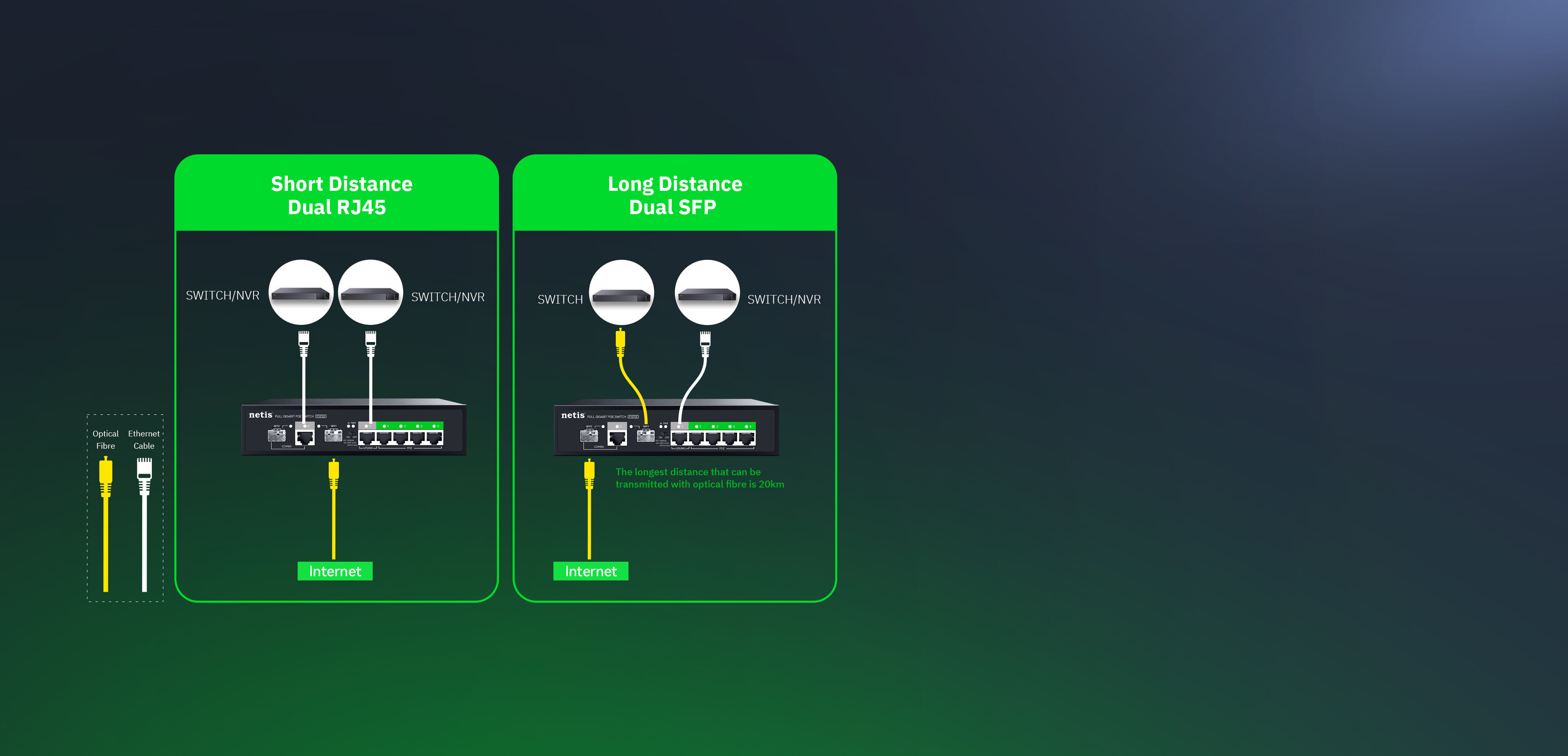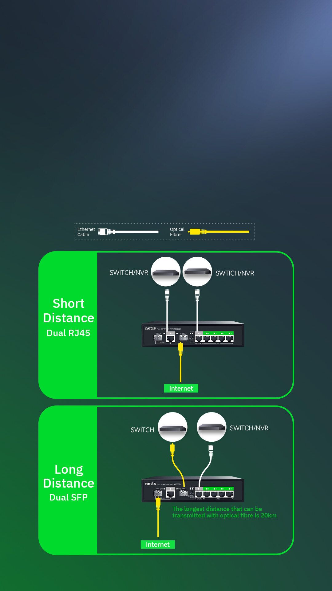 RJ45 for short distance/ SFP for long distance.