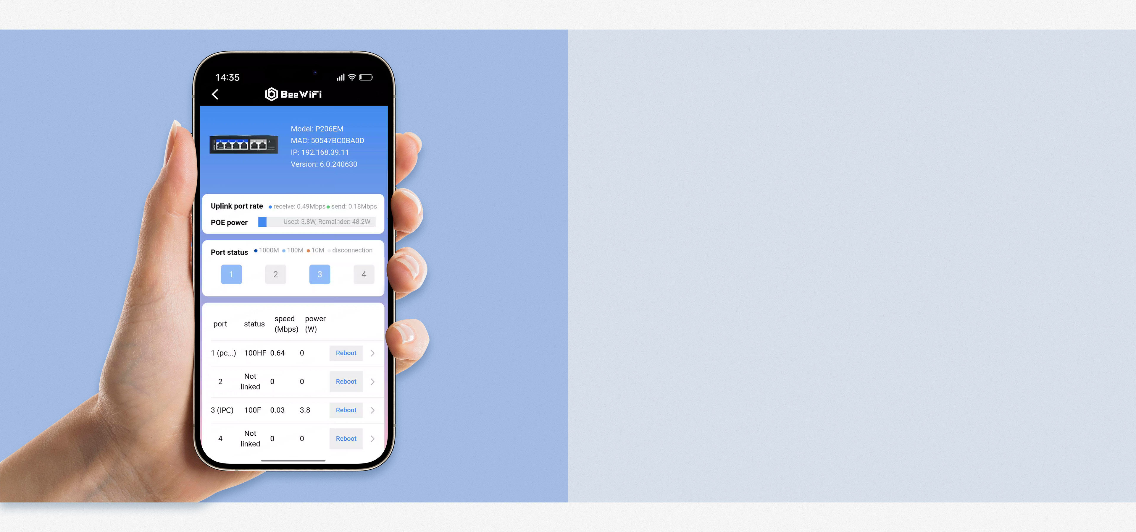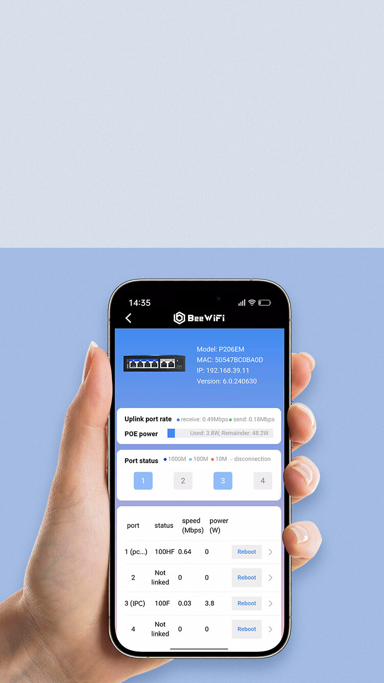 Switch SN information, device model, firmware version, real-time IP, real-time port power, port LINK status, link duplex, uplink and downlink rates |