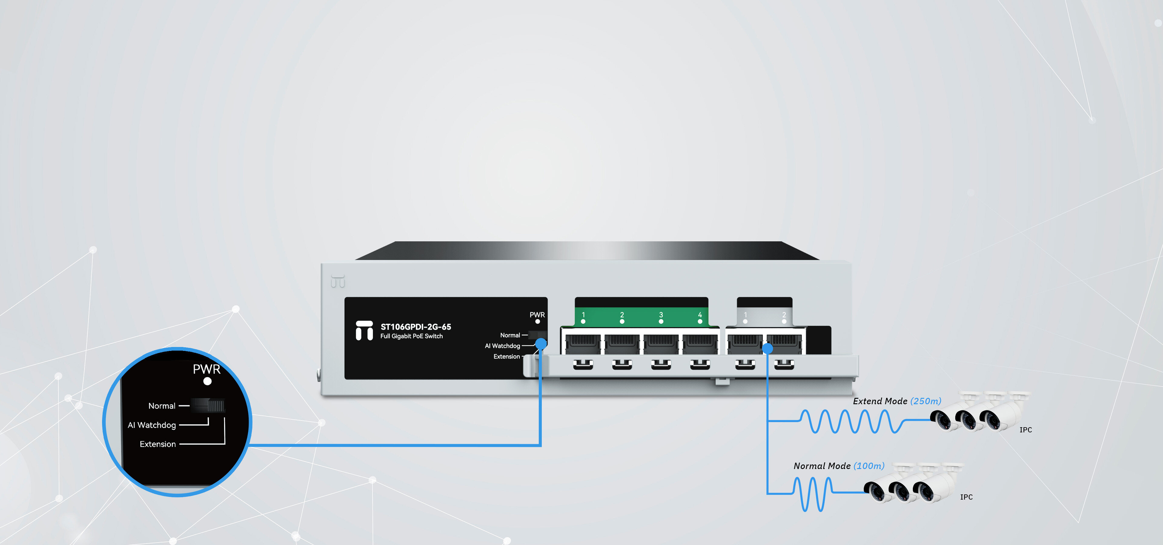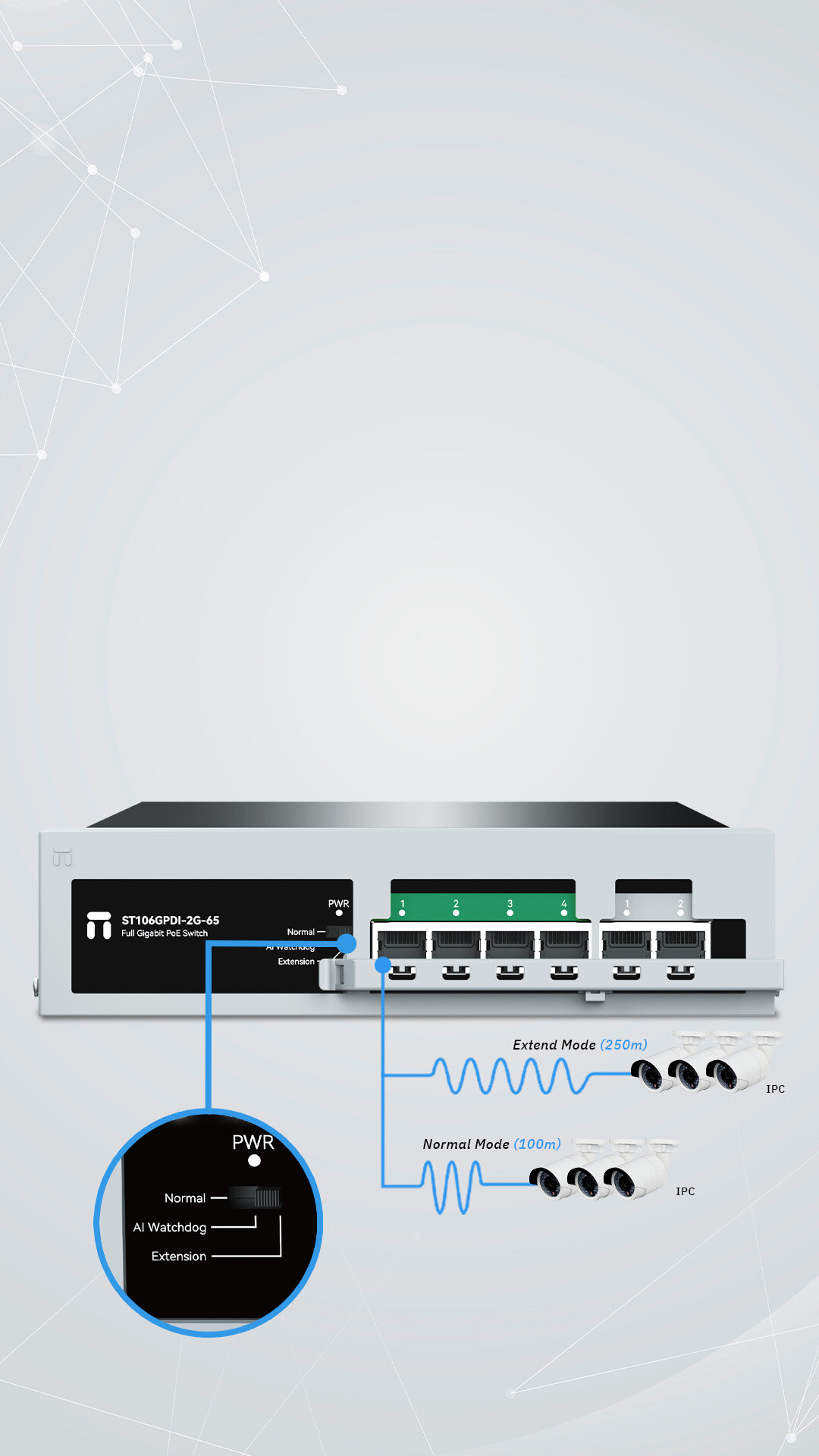 POE port :10/100M full-duplex/ half-duplex modes Uplink port : 10/100M full-duplex/ half-duplex modes 1000M full-duplex mode |